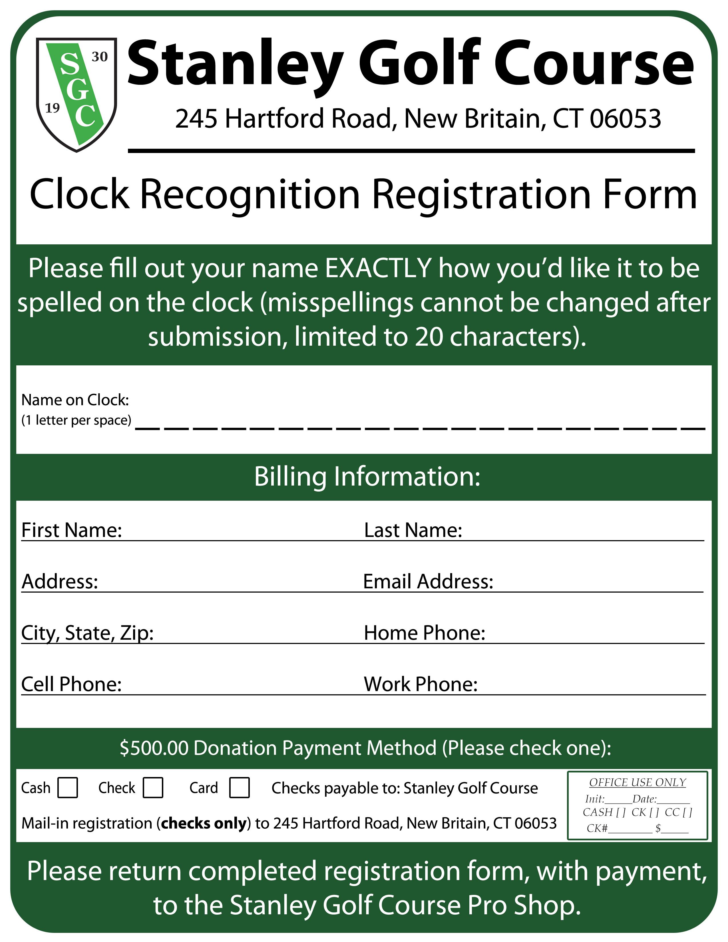 Be a part of Stanley Golf Course history and donate today! A $500 donation will enable your name to be emblazoned on a cast bronze plaque to be installed at the base of our brand new clock. The plaque will be produced when we get 20 names. It is filling up fast so don't delay!